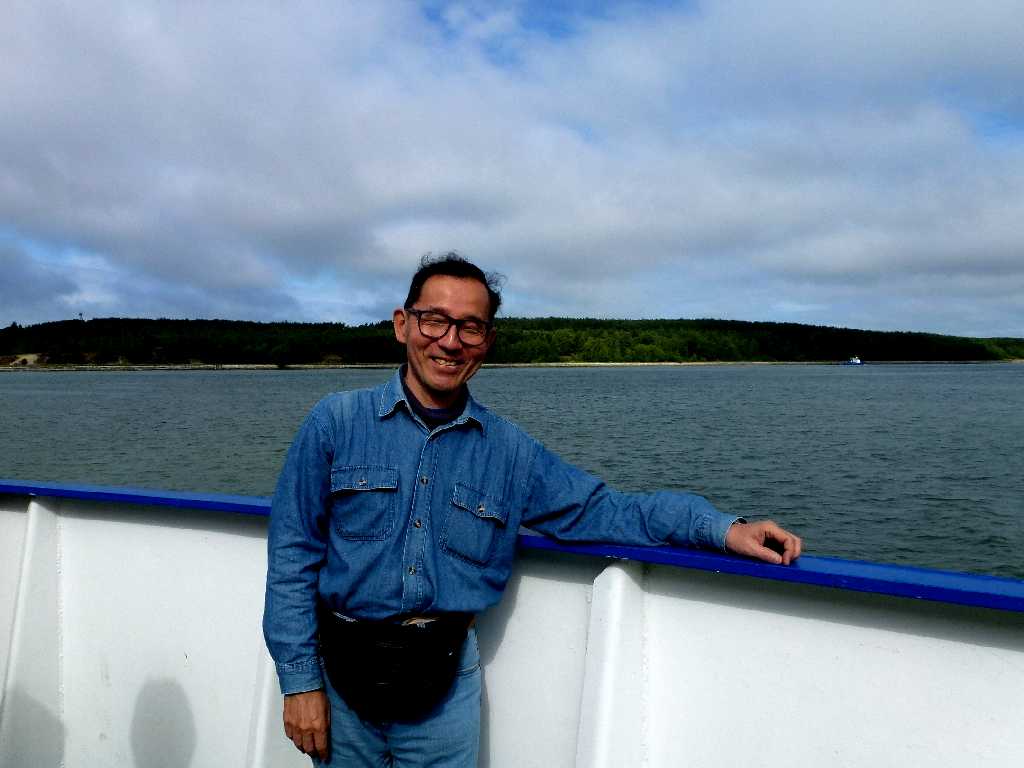 クライペダ港から外海のバルト海と内海のクルシュー潟をつなぐ海峡をフェリーでクルシュー砂州に渡る